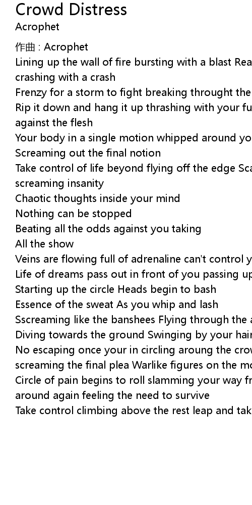 | No escaping once your in circling aroung the crowd Bodies flying every way screaming the final plea Warlike figures on the move running their own way Circle of pain begins to roll slamming your way free Wanting more you start around again feeling the need to survive | |