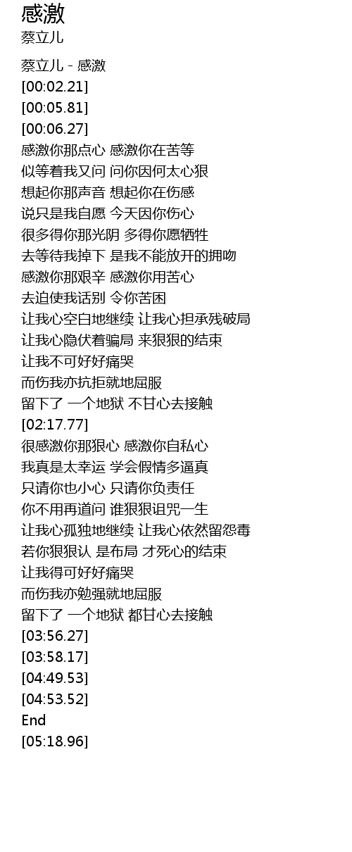 | [02:30.07] | 很感激你那狠心 感激你自私心 |