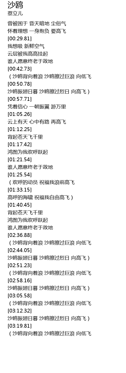 | [03:00.96] | 沙鸥振翅日暮 沙鸥擦过烈日 向高飞) |