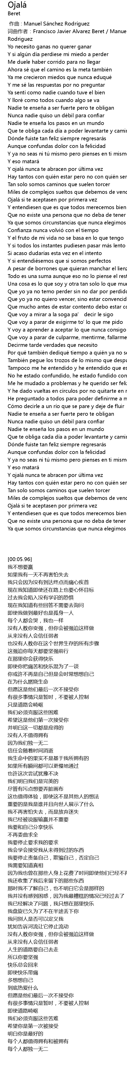 | [00:05.96] | 词曲作者:Francisco Javier Alvarez Beret / Manuel Sanchez Rodriguez |