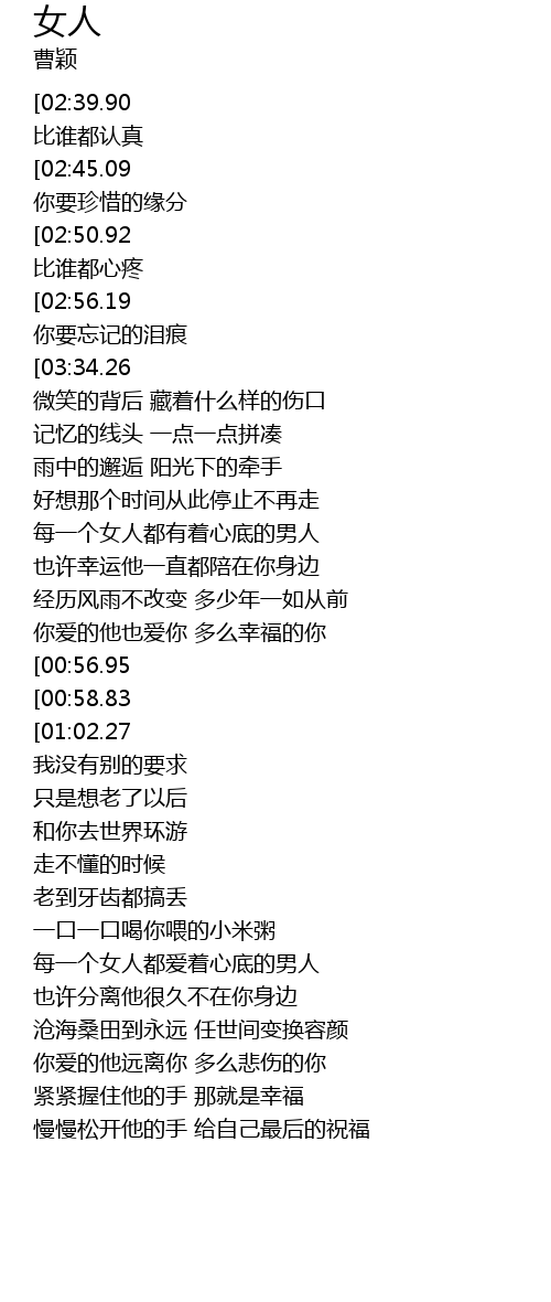 | [03:07.65][02:39.90][02:17.65][01:07.90][00:00.61] | 女人爱笑的天真 比谁都认真 |