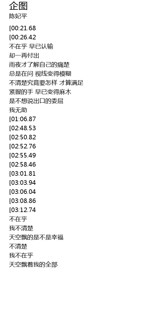 | [03:25.06][02:58.46][01:29.70] | 这是我的企图 |