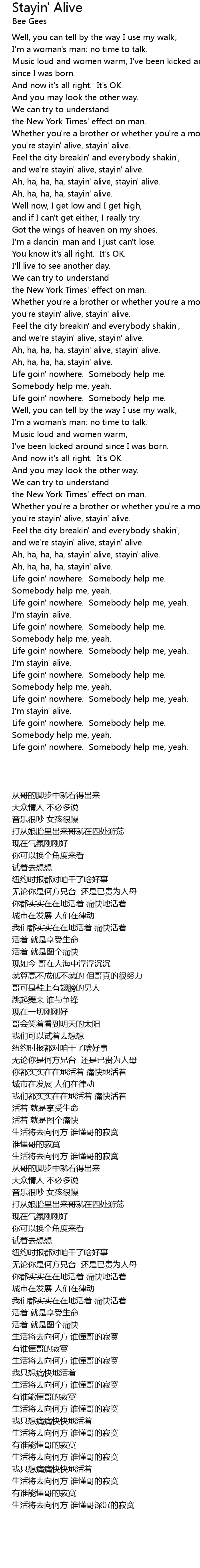 | [00:46.0] | Ah, ha, ha, ha, stayin' alive. |