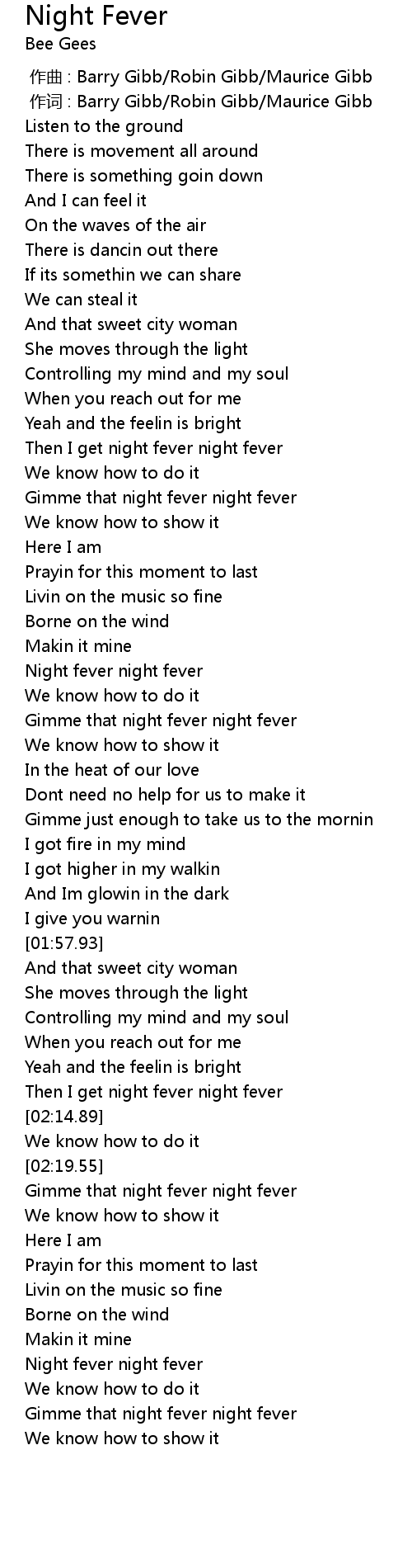 | [00:01.00] | zuò cí : Barry Gibb Robin Gibb Maurice Gibb |
