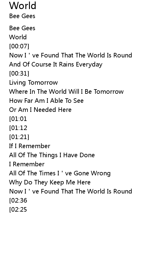 | [02:57][02:36][02:14] | And Now I ve Found That The World Is Round |