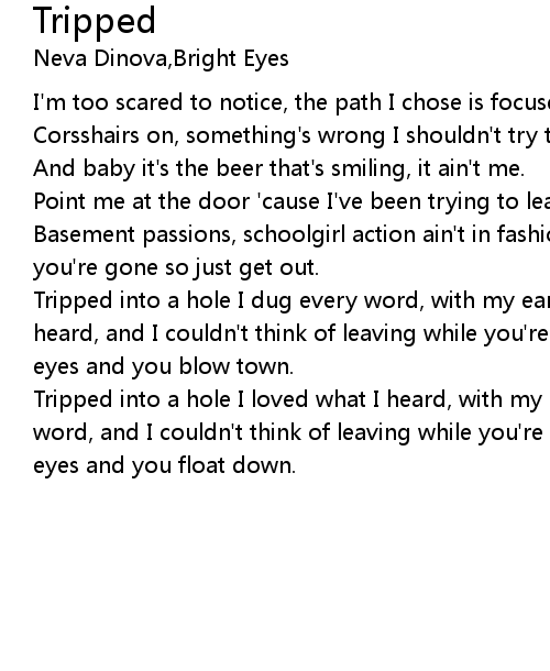 Tripped into a hole I dug every word, with my ear to the ground I loved what I heard, and I couldn't think of leaving while you're feeling down, I just rest my eyes and you blow town. |