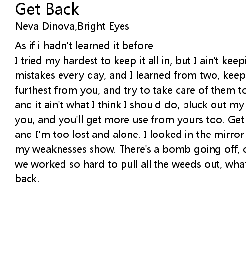 I tried my hardest to keep it all in, but I ain't keeping it in no more. Made mistakes every day, and I learned from two, keep those that you love, the furthest from you, and try to take care of them too. It's just a feeling I had, and it ain't what I think I should do, pluck out my heard and I'll give it to you, and you'll get more use from yours too. Get back, I'm too tired to go home and I'm too lost and alone. I looked in the mirror on the back of your door, all my weaknesses show. There's a bomb going off, out in the yard of the house, when we worked so hard to pull all the weeds out, what were we talking about. Get back. |