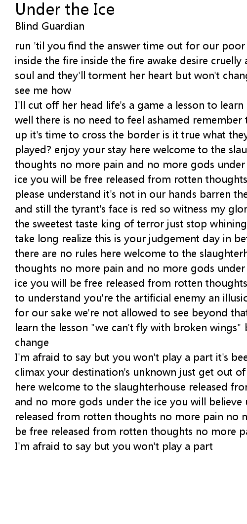 I'll cut off her head life's a game a lesson to learn don't be shy just blame me well there is no need to feel ashamed remember the oath remember the oath wake up it's time to cross the border is it true what they say about the part you've played? enjoy your stay here welcome to the slaughterhouse release from rotten thoughts no more pain and no more gods under the ice you will believe under the ice you will be free released from rotten thoughts no more pain no more gods please understand it's not in our hands barren the land it's all dead and gone and still the tyrant's face is red so witness my glory, my triumph, my fame it's the sweetest taste king of terror just stop whining hold your breath it won't take long realize this is your judgement day in between the killing carry on there are no rules here welcome to the slaughterhouse released from rotten thoughts no more pain and no more gods under the ice you will believe under the ice you will be free released from rotten thoughts no more pain no more gods try to understand you're the artificial enemy an illusion we all need for our sake for our sake we're not allowed to see beyond that's your skill will we ever learn the lesson "we can't fly with broken wings" break the chains time to change |