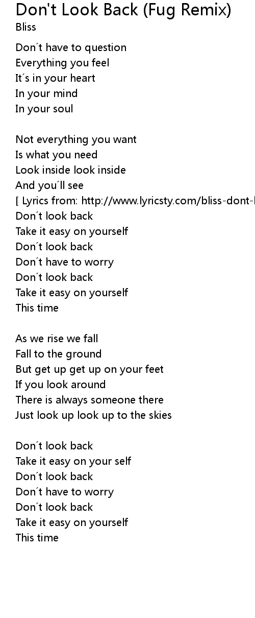 | [ Lyrics from: http://www.lyricsty.com/bliss-dont-look-back-lyrics.html ] | |