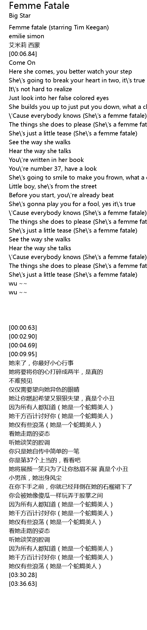 | [03:09.03] | ' Cause everybody knows She' s a femme fatale |