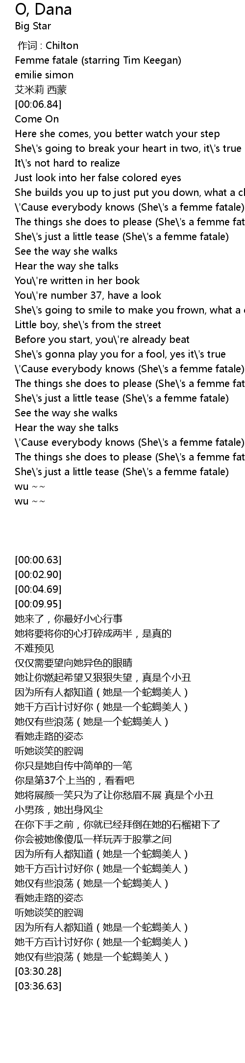 | [03:09.03] | ' Cause everybody knows She' s a femme fatale |