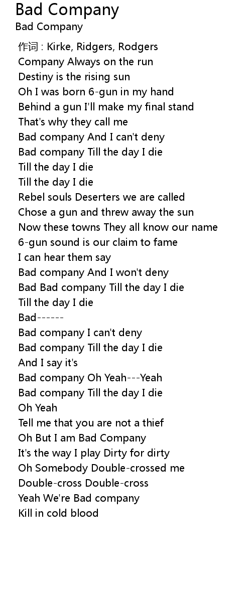 | [03:29.710] | Bad company Oh Yeah---Yeah |