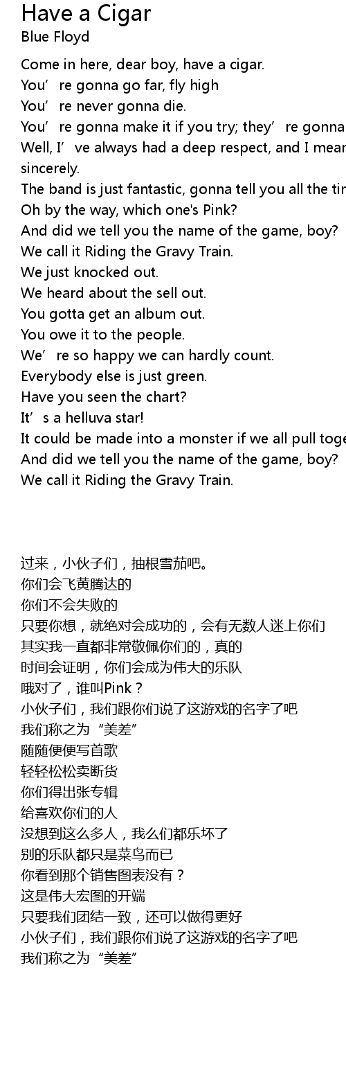 | [01:24.00] | 过来,小伙子们,抽根雪茄吧。 |