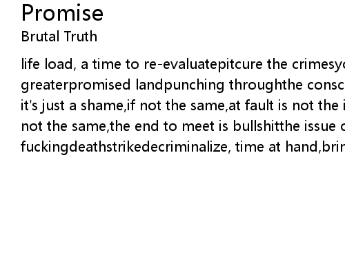 | life load, a time to re-evaluatepitcure the crimesyou re-evaluatepull unto your greaterpromised landpunching throughthe conscience of yourpromised landpull unto it's just a shame,if not the same,at fault is not the issueif blood is red, it's not the same,the end to meet is bullshitthe issue of its higherconscience, its fuckingdeathstrikedecriminalize, time at hand,bring forth the promised land |