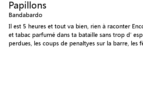 | Il est 5 heures et tout va bien, rien a raconter Encore une nuit sans chansons et tabac parfume dans ta bataille sans trop d' espoirs contre les occasions perdues, les coups de penaltyes sur la barre, les f tes ou tu n' est pas voulu |