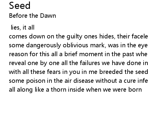 [music: Tuomas Saukkonen, words:Tuomas Saukkonen/Panu Willman] lies, it all comes down on the guilty ones hides, their faceless looks it has begun dark, some dangerously oblivious mark, was in the eyes that grave to crush was there a reason for this all a brief moment in the past when all went wrong a memory to reveal one by one all the failures we have done in you in me breeded the seed with all these fears in you in me breeded the seed behind these tears was there some poison in the air disease without a cure infected as we inhale or was it all along like a thorn inside when we were born