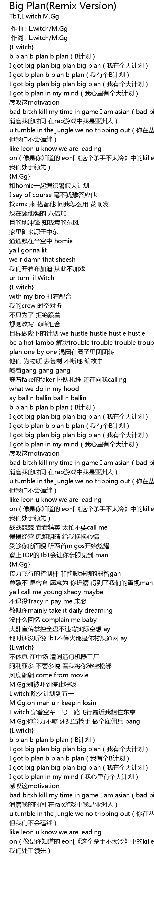 | [00:18.060] | I got big plan big plan big plan wo you ge da ji hua |