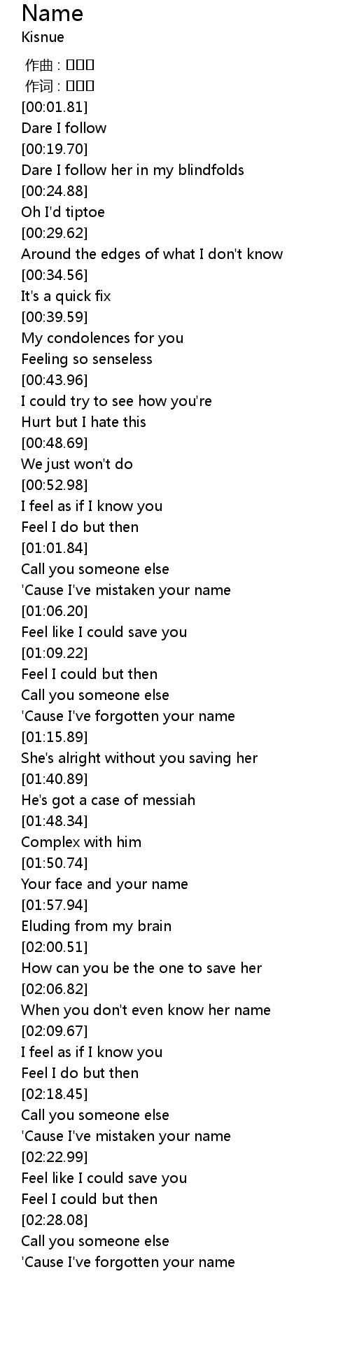 | [02:07.39] | When you don't even know her name |