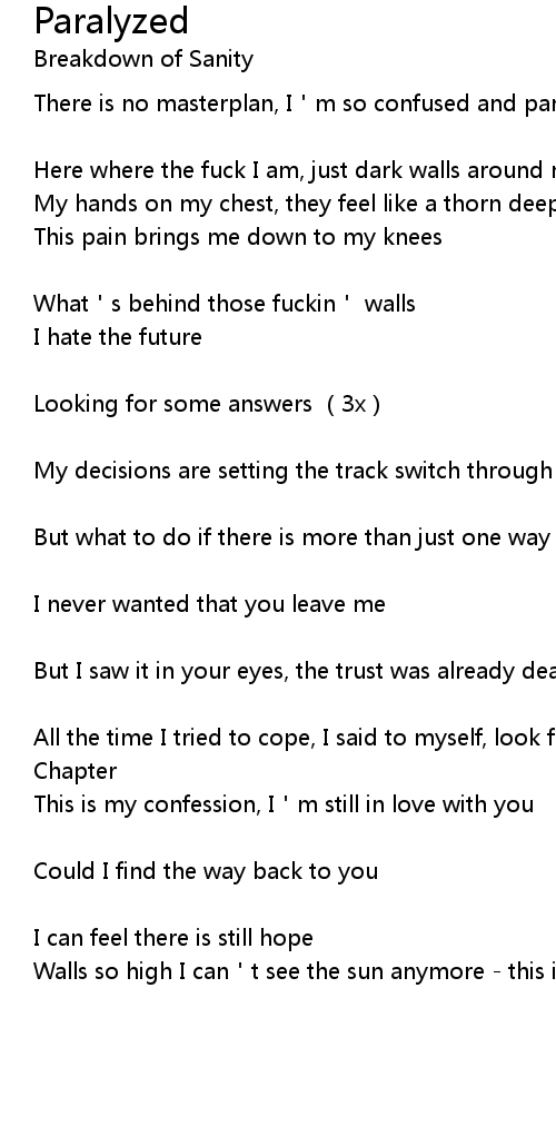 | Here where the fuck I am, just dark walls around me as high as mountains | |