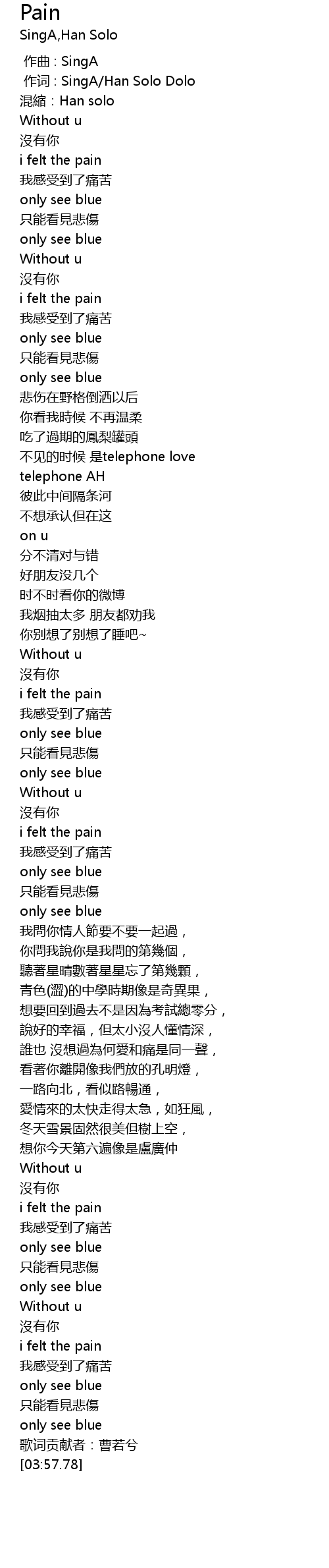 | [00:01.000] | 作词 : SingA/Han Solo Dolo |