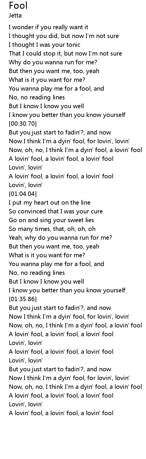 | [00:41.01] | Now, oh, no, I think I'm a dyin' fool, a lovin' fool |