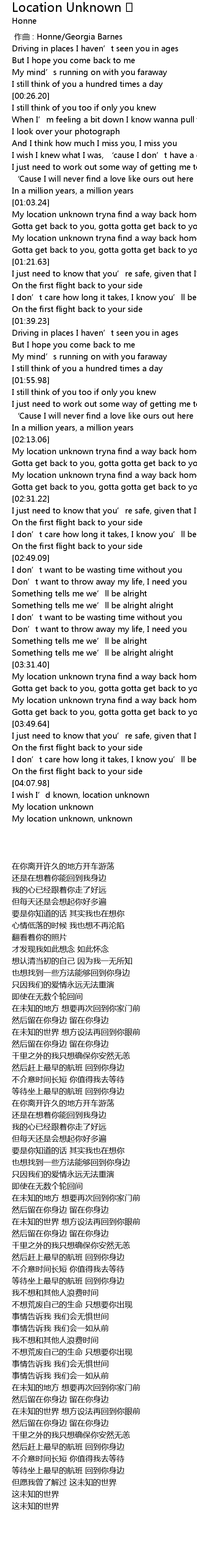 | [02:23.07] | My location unknown tryna find a way back home to you again |