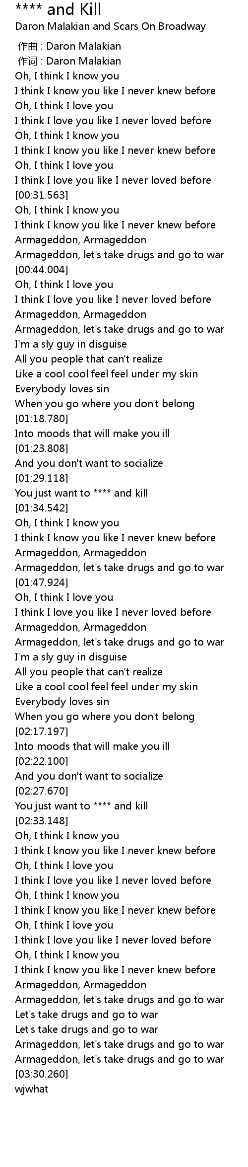 | [03:25.094] | Armageddon, let' s take drugs and go to war |