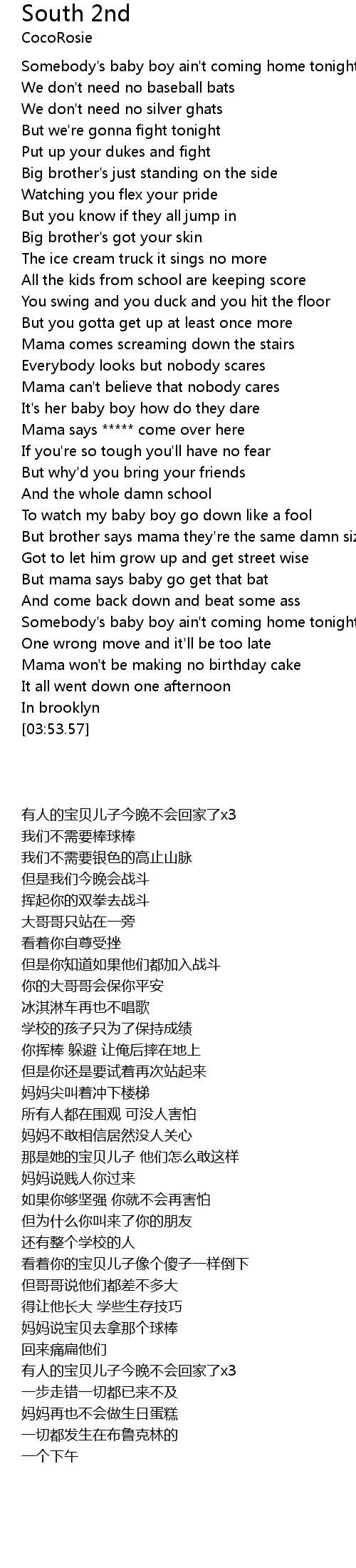 | [03:02.64] | Somebody' s baby boy ain' t coming home tonight 3 |