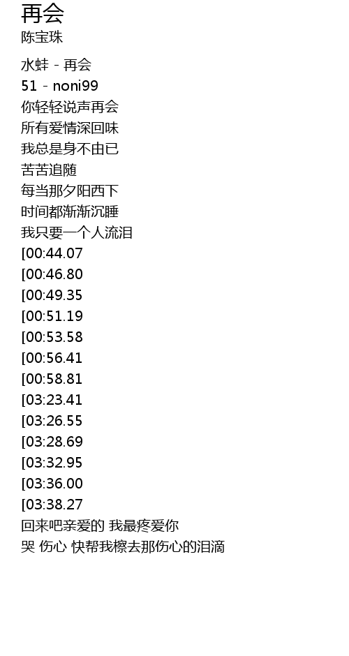 | [03:52.09][03:32.95][02:52.05][02:33.23][01:35.98][01:16.33] | wo de na mei ci xin tiao mei ci hu xi |
