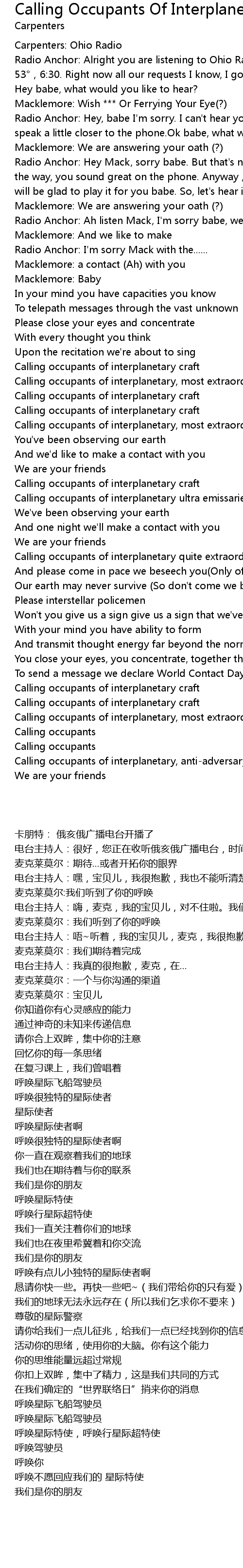 | [01:54.75] | Calling occupants of interplanetary, most extraordinary craft |