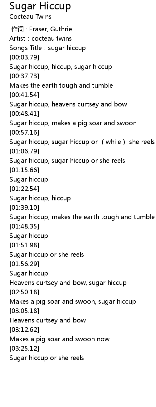 | [00:59.79] | Sugar hiccup, sugar hiccup or while she reels |