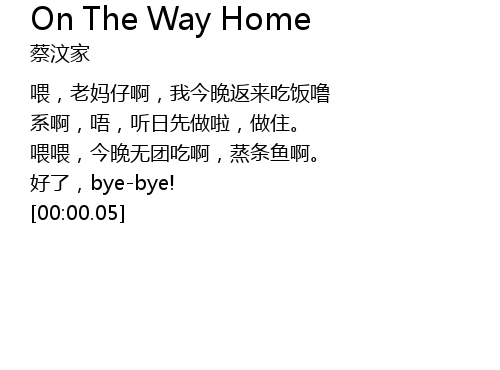 | [00:02.05] | 喂,老妈仔啊,我今晚返来吃饭噜 |