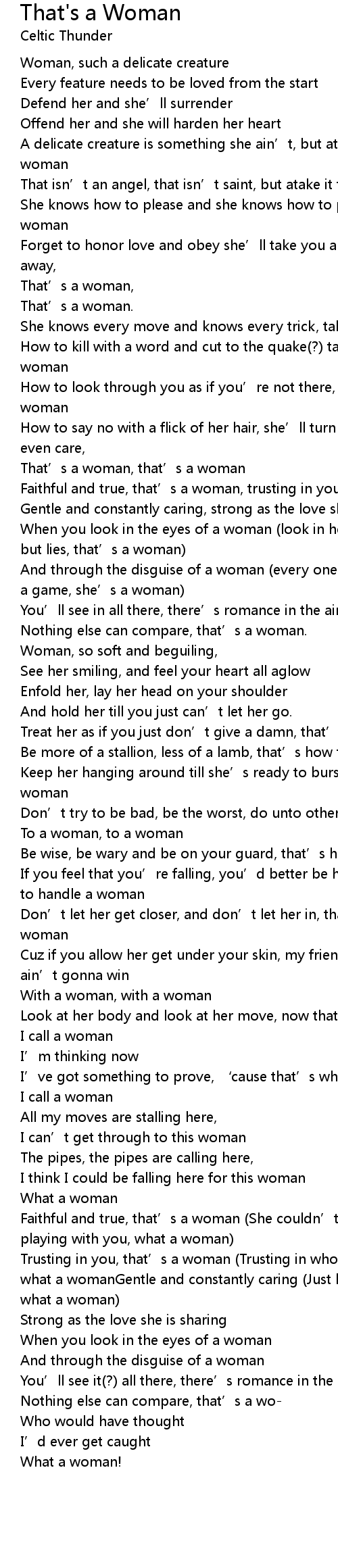 | Faithful and true, that' s a woman, trusting in you, that' s a woman | |