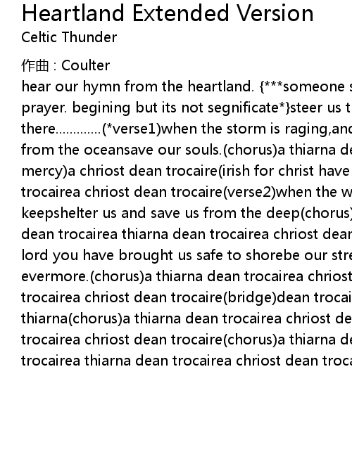 | hear our hymn from the heartland. {***someone speaks words in thehear our prayer. begining but its not segnificate*}steer us through stormy waterslead us there.............(*verse1)when the storm is raging,and thunder rolls,deliver us from the oceansave our souls.(chorus)a thiarna dean trocaire(irish for lord have mercy)a chriost dean trocaire(irish for christ have mercy)a thiarna dean trocairea chriost dean trocaire(verse2)when the winds are howlingvigil keepshelter us and save us from the deep(chorus)a thiarna dean trocairea chriost dean trocairea thiarna dean trocairea chriost dean trocaire(verse3)thank you lord you have brought us safe to shorebe our strength and protection evermore.(chorus)a thiarna dean trocairea chriost dean trocairea thiarna dean trocairea chriost dean trocaire(bridge)dean trocairedean trocairea thiarna(chorus)a thiarna dean trocairea chriost dean trocairea thiarna dean trocairea chriost dean trocaire(chorus)a thiarna dean trocairea chriost dean trocairea thiarna dean trocairea chriost dean trocaire |