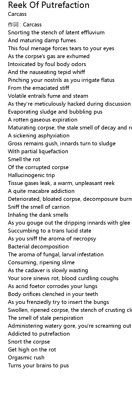 | Swollen, ripened corpse, the stench of crusting clots | |