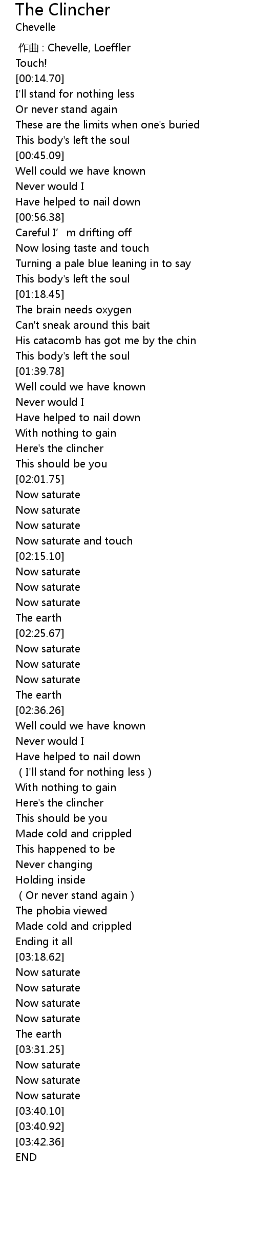 | [00:00.00] | 作曲 : Chevelle, Loeffler |