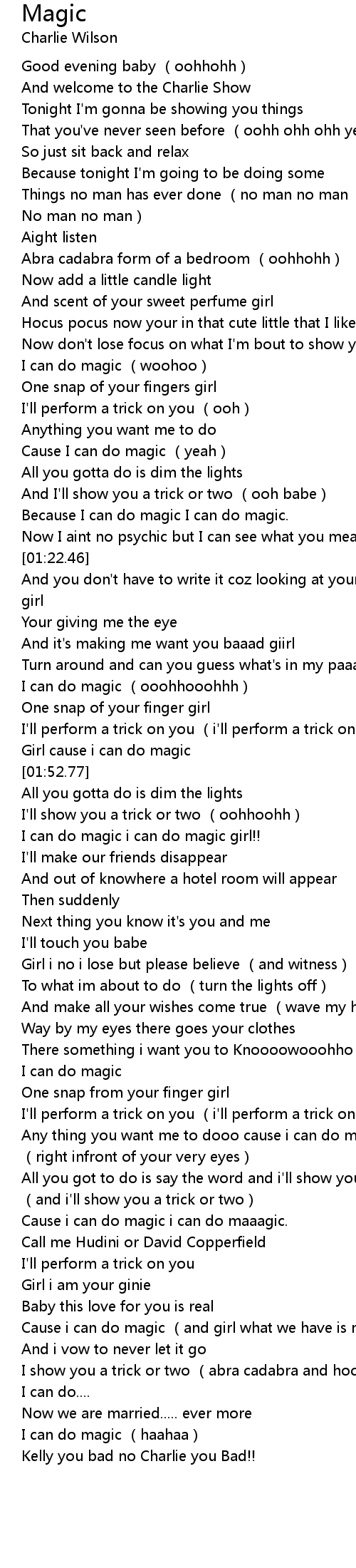 | [03:13.71] | Cause i can do magic (and girl what we have is magic ooh) |