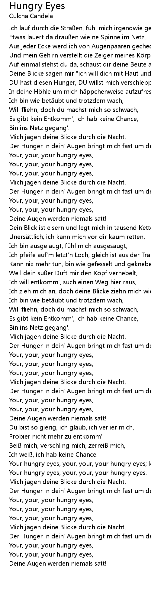| Der Hunger in dein' Augen bringt mich fast um den Verstand. | |