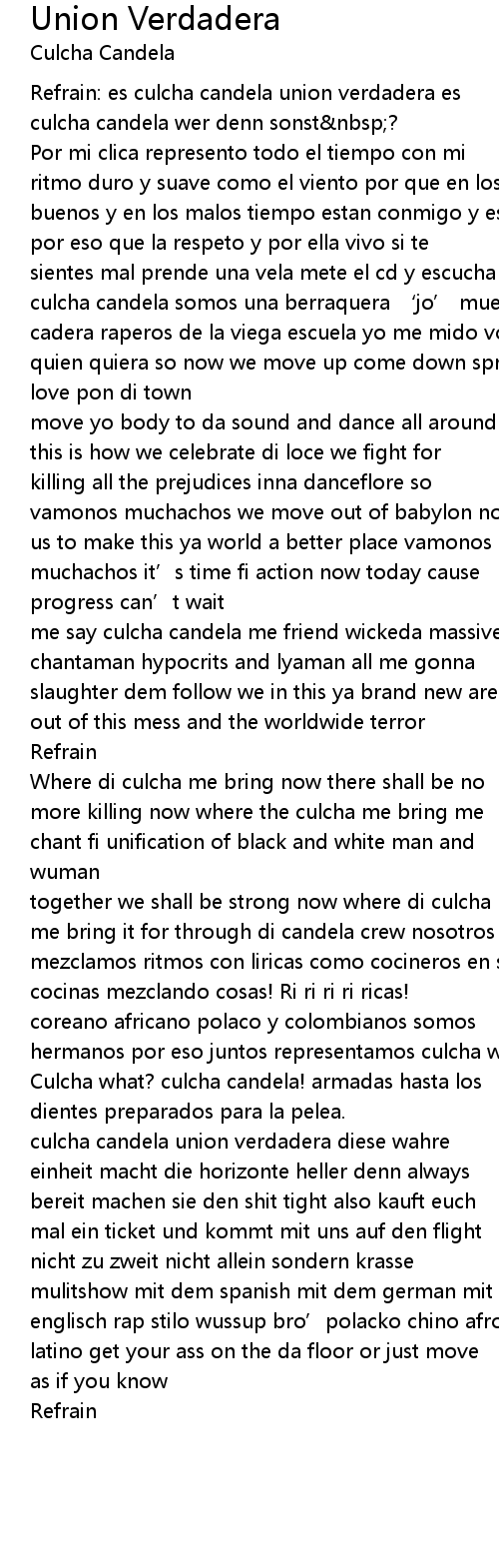 | Refrain: es culcha candela union verdadera es | |