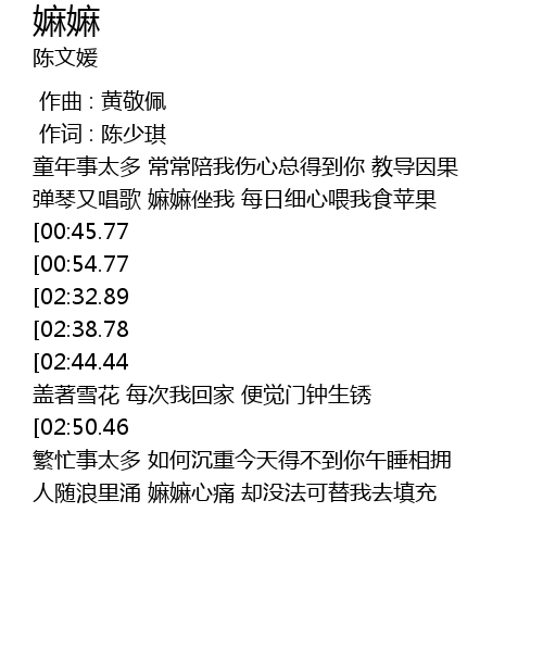 | [00:34.60] | 弹琴又唱歌 嫲嫲侳我 每日细心喂我食苹果 |