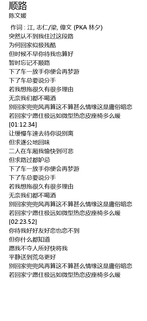 | [02:15.24] | 若回家宁愿住极远如微型热恋皮座椅多么暖 |