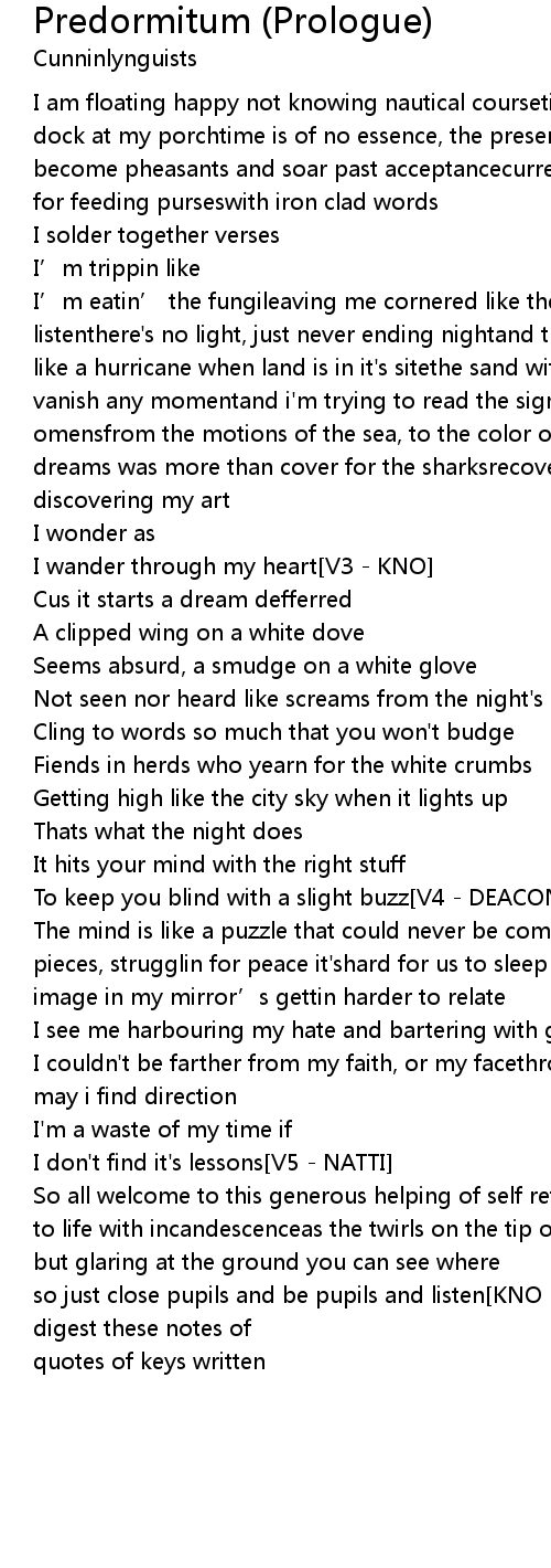 | So all welcome to this generous helping of self reflectionnight thoughts brought to life with incandescenceas the twirls on the tip of our indexstaring into space one’s vision is endless[KNO]but glaring at the ground you can see where the end is[NATTI]so just close pupils and be pupils and listen[KNO]the headset’s your desk the test is what’s missin[NATTI]digest these notes of quotes of keys written |