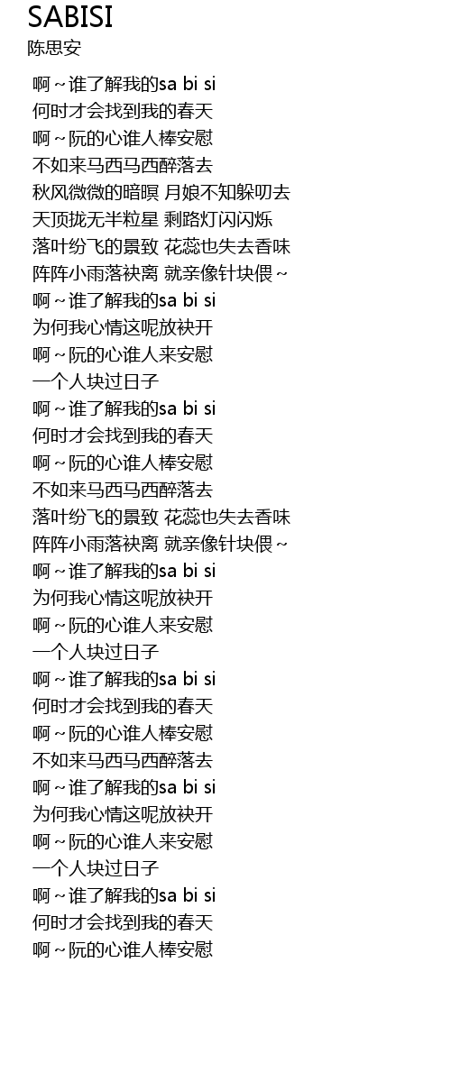 | [00:19.05] | a shuí liǎo jiě wǒ de sa bi si |