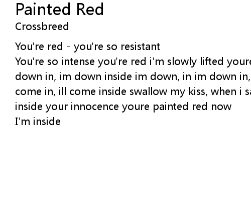 | You're so intense you're red i'm slowly lifted youre painted red im down in, im down in, im down inside im down, in im down in, im down inside ill come in, ill come in, ill come inside swallow my kiss, when i save you youre red and im inside your innocence youre painted red now | |