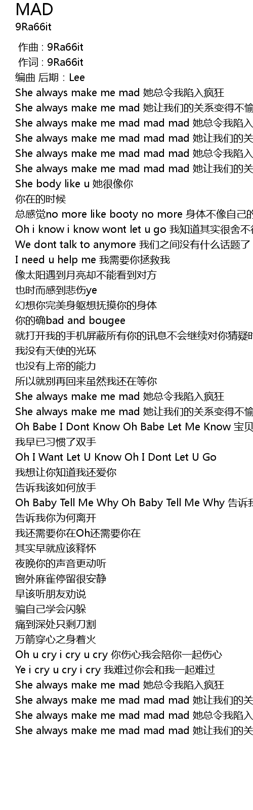 | [00:30.196] | She always make me mad mad mad 她总令我陷入疯狂 |