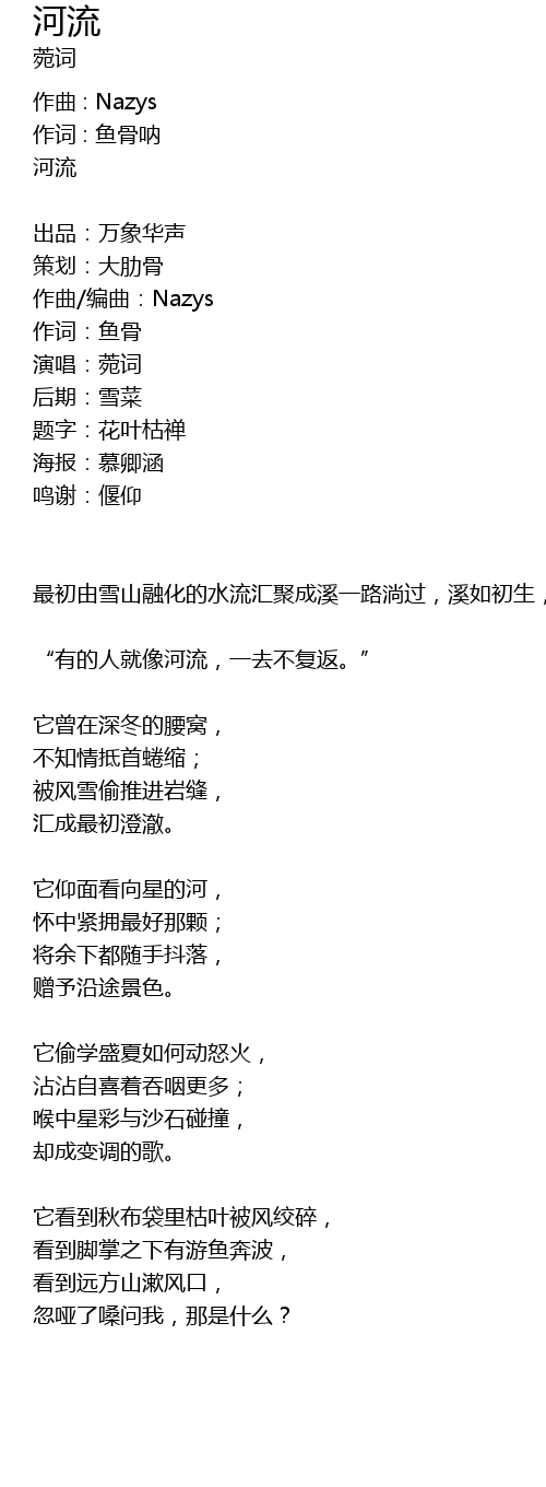 | zuì chū yóu xuě shān róng huà de shuǐ liú huì jù chéng xī yí lù tǎng guò, xī rú chū shēng, hé rú měng dǒng, jiāng shì chéng zhǎng, ér zuì hòu rù hǎi, shì mí máng. yí lù qián xíng, yí lù jí qǔ. wàn wù shǒu héng, dé dào de hé diū diào de qí shí yí yàng duō. zuì hòu de zuì hòu, tā dé yǐ rù hǎi, què wàng le chū shēng shí de zì yóu shì shén me yàng zi. | |