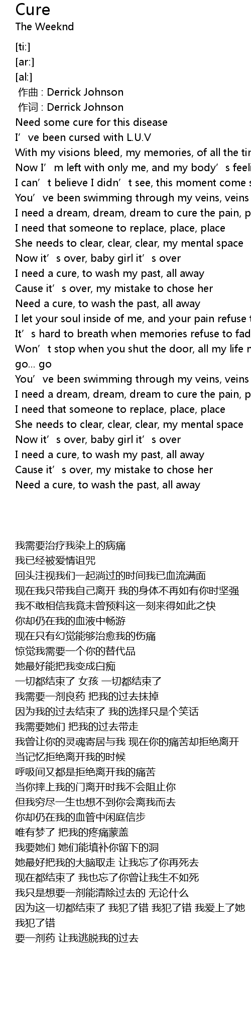 | [00:12.38] | 我需要治疗我染上的病痛 |