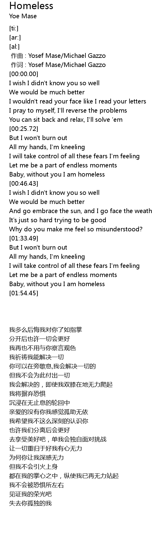 | [01:50.05] | Baby, without you I am homeless |