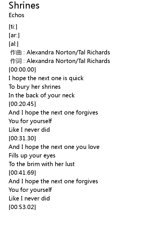 | [00:00.000] | zuò qǔ : Alexandra Norton Tal Richards |