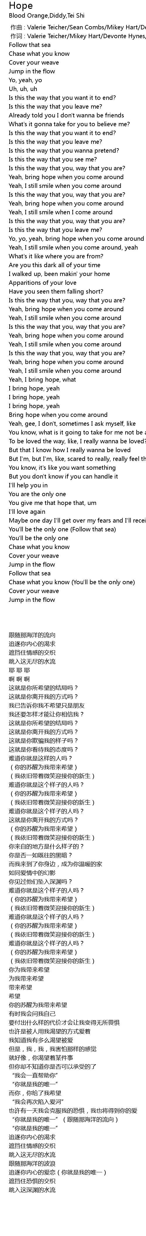 | [00:00.011] | 作词 : Valerie Teicher/Mikey Hart/Devonte Hynes/Sean Combs |